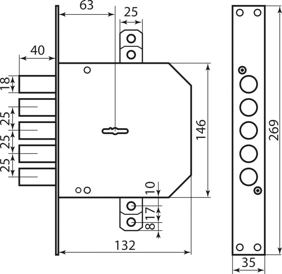 Mottura Замок 4-ригельний із засувкою під тяги (без накладок) (37959)